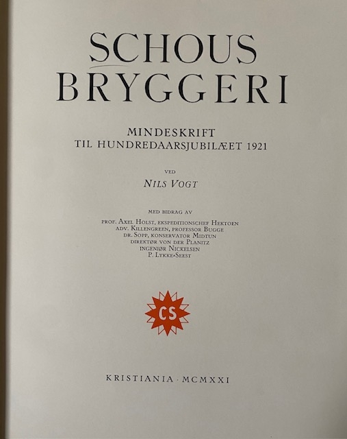 Antikk fagbok Schous Bryggeri Mindeskrift til hundredaarsjubilææt Nils Vogt Centraltrykkeriet Kristiania 1921