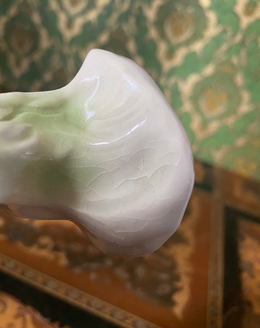 Dette fugleparet har tydeligvis vært et populært motiv første del av 1900 tallet, men opprinnelsen til vasen har jeg ikke klart å avdekket til tross at den er nummerert/ signert. Mål H17x L10x B8 cm. Produksjonsfeil på baksiden ellers i flott stand.