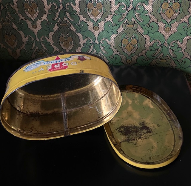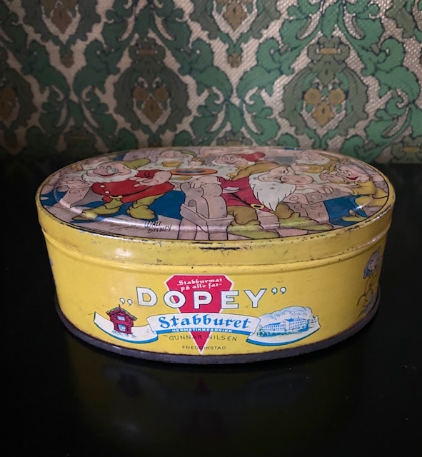 Boksen antas å være fra første halvdel av 1900-tallet. Mål ca H4,5x L23,5x B12,5 cm. Boksen har fått noen bulker og skjevheter, samt det finnes aldersrelatert patina/ slitasje. Til tross for patina er motiv og farger godt ivaretatt og boksen er dekorativ.