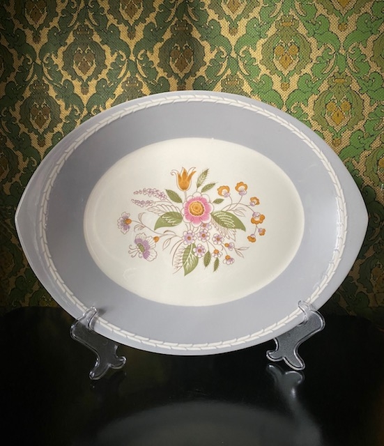 Skål uten skader, krakelering, slitasje av dekor eller skjemmende bruksmerker. Helene blomsterdekor (skyvebilde) på denne modellen var ikke vanlig (ref. digitaltmuseum.no). Mål ca H6xL24,5xB22,3 cm.