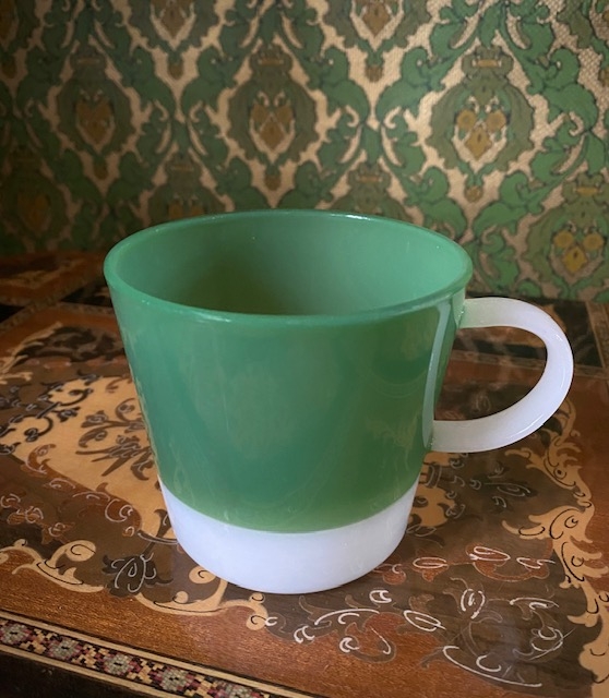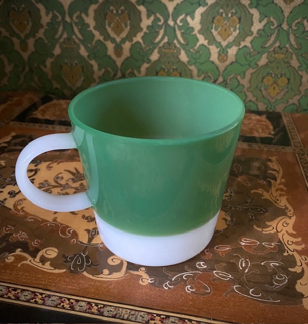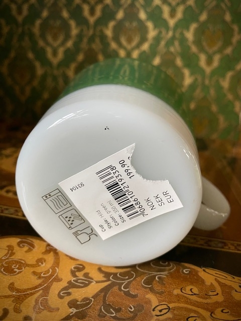 Hild grønn/hvit glasskopp/krus med hank Local Chef Kopp i pent brukt stand. Delikat jadegrønn og hvit farge. Mål H8,2x Ø9,0 cm. NOK60,00 inkl. mva. På lager: 4 stk. Kjøp Ønskeliste Del dette Produktinfo Varen kan sendes eller hentes etter avtale på butikklageret i Tysvær NB! man får spørsmål om hente/sending først etter at man har registrert adressen. Fast fraktpris 73 kr for kjøp < 1000 kr og gratis frakt ved kjøp ≥ 1000 kr (Begge alternativene gjelder for forsendelser med vekt 0-10 kg). Har du bestilt, men hører ikke noe i fra meg? Sjekk mappen for spam mail.