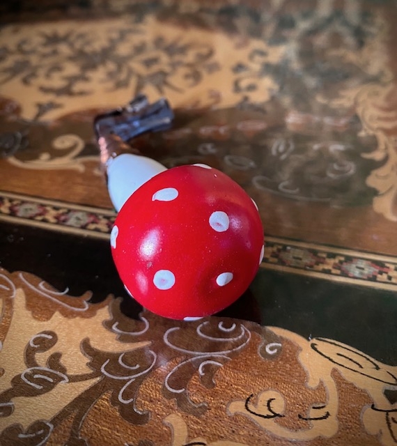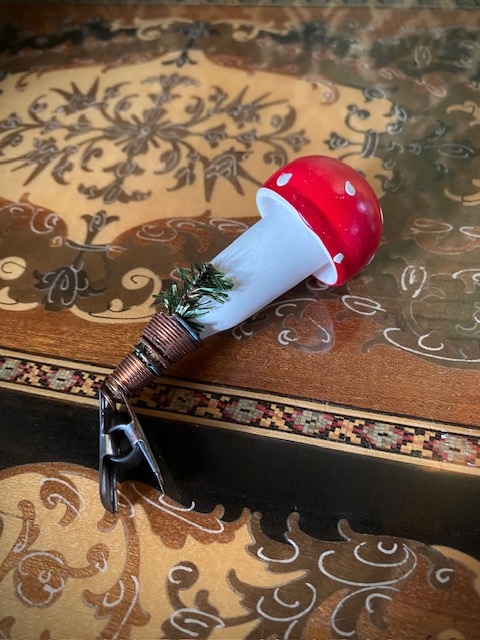 Et mindre vintage glasspyd. Ingen skader, men det finnes noe slitasje på den håndmalte dekoren, fortrinnsvis opp mot kanten der det skal festes til treet. Mål ca L18,5x B4,4 cm.
