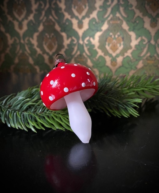 Juletrepynt julekule ornament sopp fluesopp håndmalt glass 1950/60-tallet