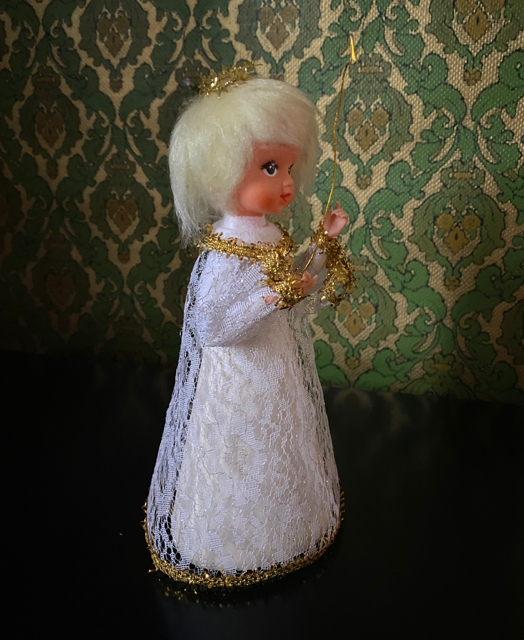 Et mindre vintage glasspyd. Ingen skader, men det finnes noe slitasje på den håndmalte dekoren, fortrinnsvis opp mot kanten der det skal festes til treet. Mål ca L18,5x B4,4 cm.
