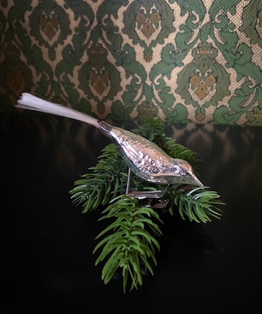 Et mindre vintage glasspyd. Ingen skader, men det finnes noe slitasje på den håndmalte dekoren, fortrinnsvis opp mot kanten der det skal festes til treet. Mål ca L18,5x B4,4 cm.