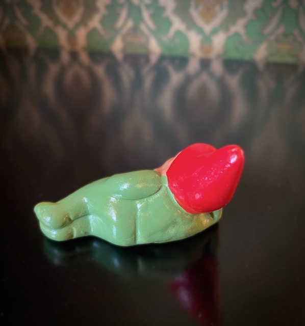En ekstra flott versjon av BRIO nissen i plast ( H17,5 cm). Denne nissen har nemlig en velur lignende rød nissefrakk og lue og ikke bare malte overflater. Det er litt slitasje og en flekk, men han er frisk i fargen og har et stort sjarmerende smil.