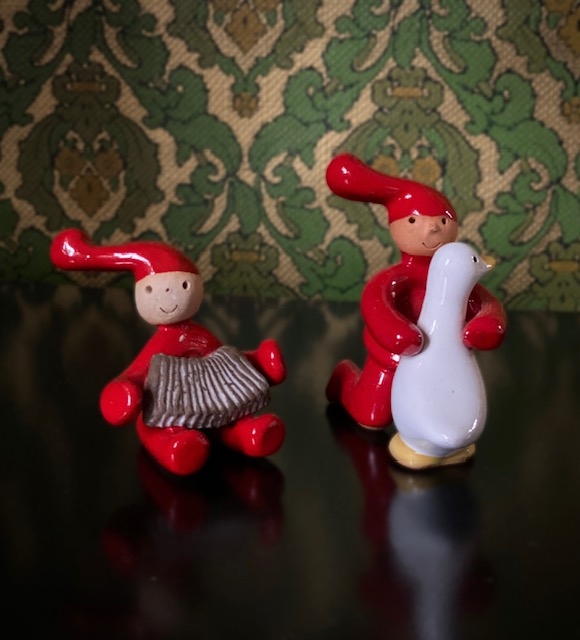 En ekstra flott versjon av BRIO nissen i plast ( H17,5 cm). Denne nissen har nemlig en velur lignende rød nissefrakk og lue og ikke bare malte overflater. Det er litt slitasje og en flekk, men han er frisk i fargen og har et stort sjarmerende smil.