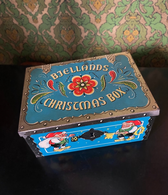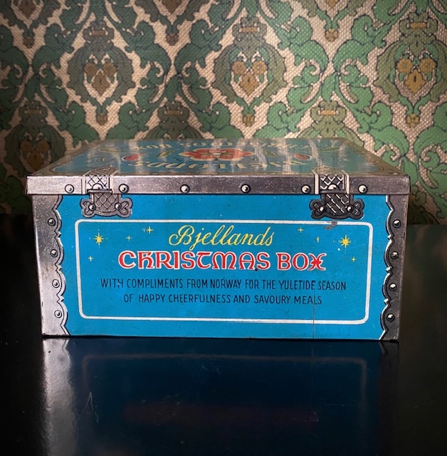 Reklame Bjellands Christmas box blikkboks/skrin med hengslet lokk CHR. BJELLAND & CO A/S Stavanger Norge 1940-tallet