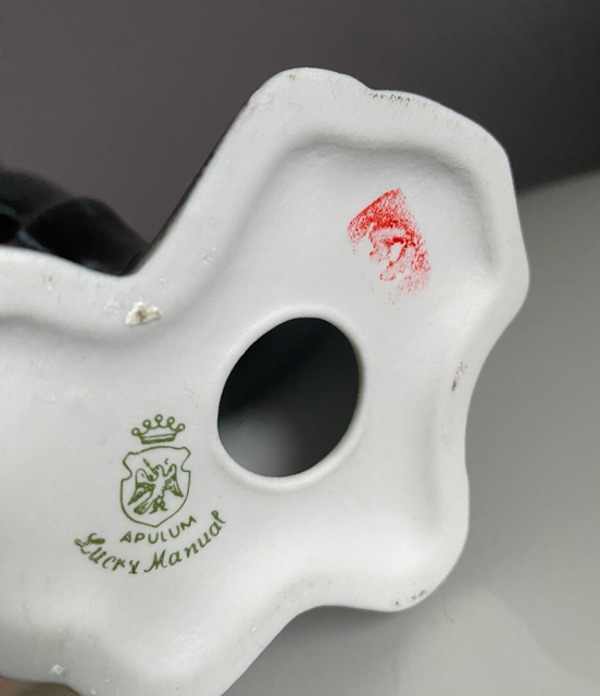 Porselens figur - Apulum Lucru Manual/ Romania, 1980 tallet Sort glasert porselens damefigur med gulldetaljer. Designet og produsert av Apulum Lucru Manual, Romania. Mål H28x L9x B8 cm. Tidstypisk postmodernistisk design og i flott vintage stand. NOK227,00 inkl. mva. På lager: 1 stk. Kjøp Ønskeliste Vipps hurtigkasseKjøp nå med Vipps hurtigkasse Del dette