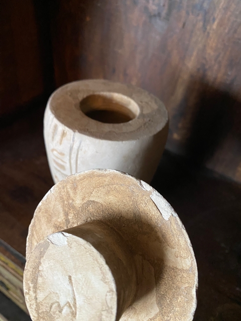 Tidligere eier oppgav at den ble kjøpt i Egypt for 30 år siden og at den er blitt vurdert til å være antikk. Mål ca H22xØ9 cm. Bavian hodet symboliserer Guden Hapi en av Horus` fire sønner. Ingen skader, men det finnes alders relatert patina.