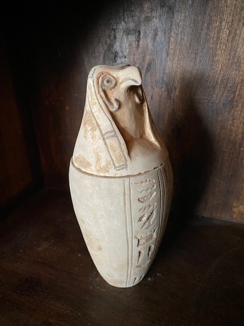 Antikk kanopisk gravurne kalksteinskrukke hieroglyfisk inskripsjoner dyrehode ape bavian Guden Hapi Egypt