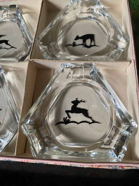 En svært spesiell karaffel med 6 stk tilhørende glass/ krus med hank. Opprinnelse og alder ukjent, men sirkusbjørner er/var vanlig i bl.a Russland. Ingen skader eller skjemmende bruksmerker, i flott vintage stand. Karaffelen H26 cm og glass H4x Ø3,3 cm.