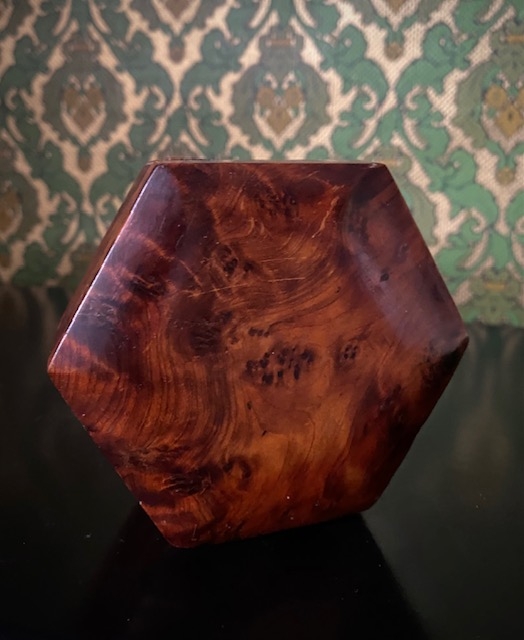 Faktisk alder og opprinnelse til dette dekorative skrinet er ukjent. Det er rikt dekorert. blant annet med innlagt dekor i lokk. Mål H6xX L20 xB9 cm. Ingen skader eller skjemmende bruksmerker, skrinet fremstår i pent brukt stand.