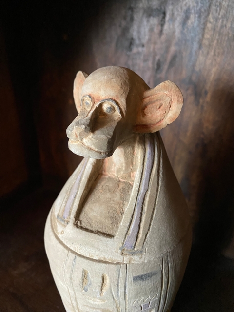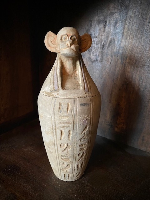 Antikk kanopisk gravurne kalksteinskrukke hieroglyfisk inskripsjoner dyrehode ape bavian Guden Hapi Egypt