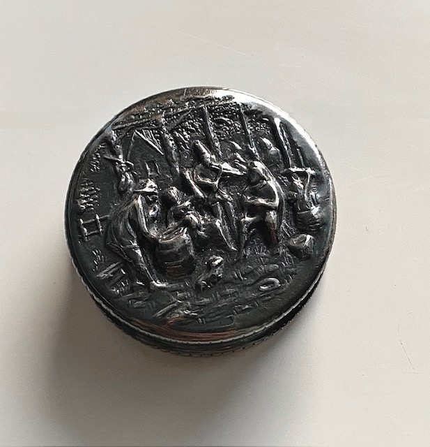 Forsølvet silver platted pilleboks med bonderomantisk relieff motiv