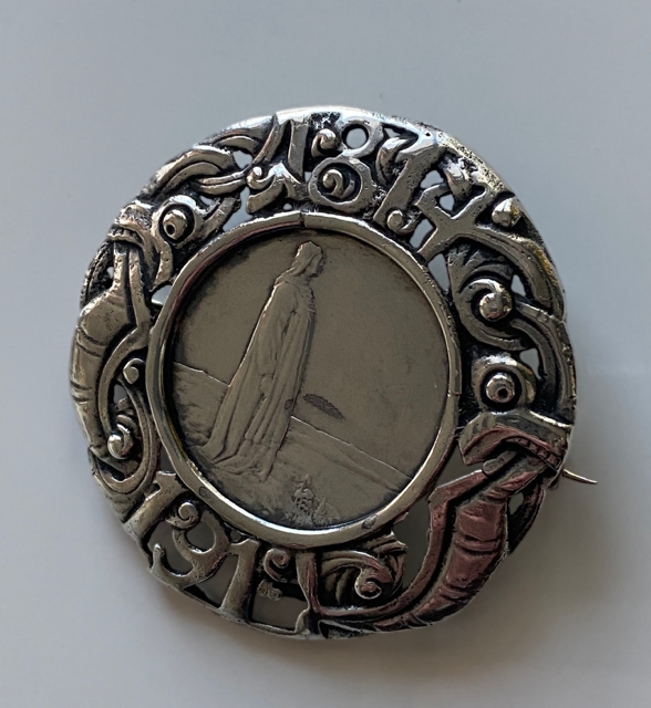 Skade/ mangel høyre side Mor Norge Norsk antikk brosje i sølv med innfelt 2-krone mynt norrøn viking mønster I.G. 830S Brosjen har omfattende aldersrelatert patina og det synes å være en skade/ mangel på høyre side ( se bilde nr 2), til tross for dette fremstår den som et flott og spennende samleobjekt. Diameter ca 5 cm. NOK495,00 inkl. mva. På lager: 1 stk. Kjøp Ønskeliste Vipps hurtigkasseKjøp nå med Vipps hurtigkasse Del dette Produktinfo Varen kan sendes eller hentes etter avtale på butikklageret i Tysvær NB! man får spørsmål om hente/sending først etter at man har registrert adressen. Fast fraktpris 73 kr for kjøp <1000 kr og gratis frakt ved kjøp ≥1000 kr (Begge alternativene gjelder for forsendelser med vekt 0-10 kg). Har du bestilt, men hører ikke noe i fra meg? Sjekk mappen for uønsket e-post.