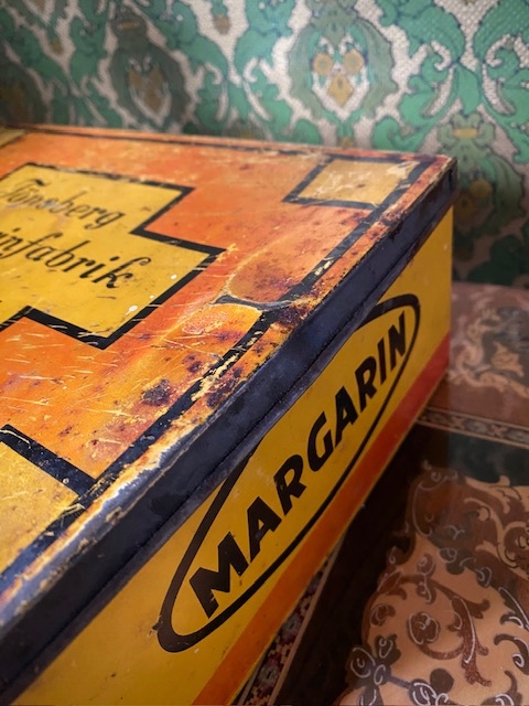Boksen antas å være fra første halvdel av 1900-tallet. Mål ca H4,5x L23,5x B12,5 cm. Boksen har fått noen bulker og skjevheter, samt det finnes aldersrelatert patina/ slitasje. Til tross for patina er motiv og farger godt ivaretatt og boksen er dekorativ.