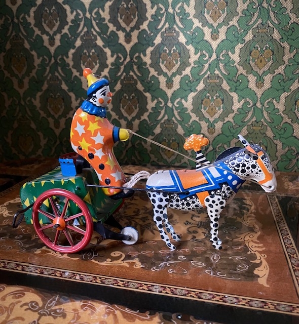 Motorsykkel i blikk. Trekkopp/ mekanisk leke med nøkkel og fungerende. H12,5x L18,5x B4 cm. Sykkelen har patina og aldersrelaterte bruksmerker, men er uten tvil veldig artig, dekorativ og et ettertraktet samleobjekt.