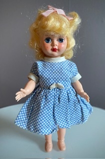Ikke så ofte man finne Franske celluloid dukker i Norge. Merket med ørnehode og "France 47 1/2". Faste øyne, lukket munn og malt hår. Litt slitasje på hårfargen på bakhodet og sprekk i støype skjøt på baksiden av lår. Nyere, men tidsriktige klær. Nydelig.