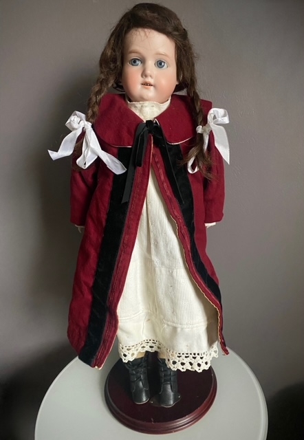 Antatt Tysk dukke med hode i porselen, kropp i komposittmaterialet, glassøyne og hår i ukjent materialet. Håret er løst, krakelering maling torso og avskalling hårfestet bak. Sko og klær uten skjemmende flekker, men med aldersrelatert slitasje. H37 cm.