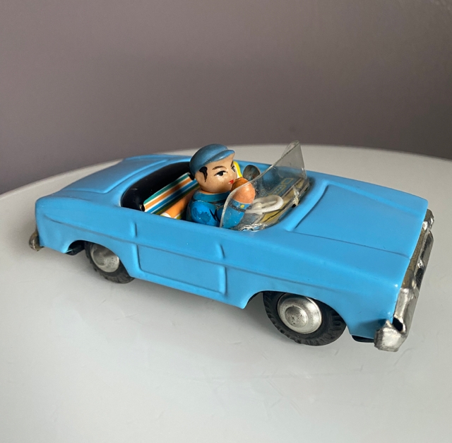 Sportsbil, lekebil i blikk - Kina, 1950/60 tallet Blå lekebil i blikk med friksjonsmotor (MF 171). Litho, China MF. L14x H6x B6,5 cm. Den triller fint over gulvet. Lite alderspatina og i flott vintage stand. NOK150,00 inkl. mva. Utsolgt Ønskeliste Del dette