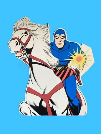 2-sidig vegghengt pappfigur av Fantomet i "action" på hest. KFC INC/ Distr Bulls. Mål 58,5x 47 cm. Anmerkning hodet til fantomet, brett. Er ikke på noe vis skjemmende og sees bare ved nærmere ettersyn.