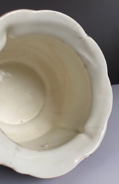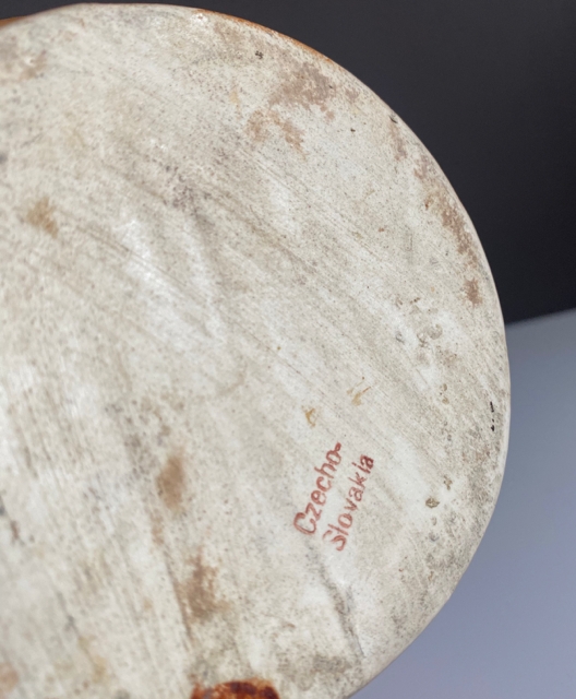 Faktisk alder og produsent er ukjent. men potten er med stemplet "Czecho-Slovakia" og det kan tyde på at den kan nærme seg 100 år. Mål H12,5x Ø13,5 cm. Ingen skader, men det finnes patina og (begrensede) områder hvor glasuren har krakelert.