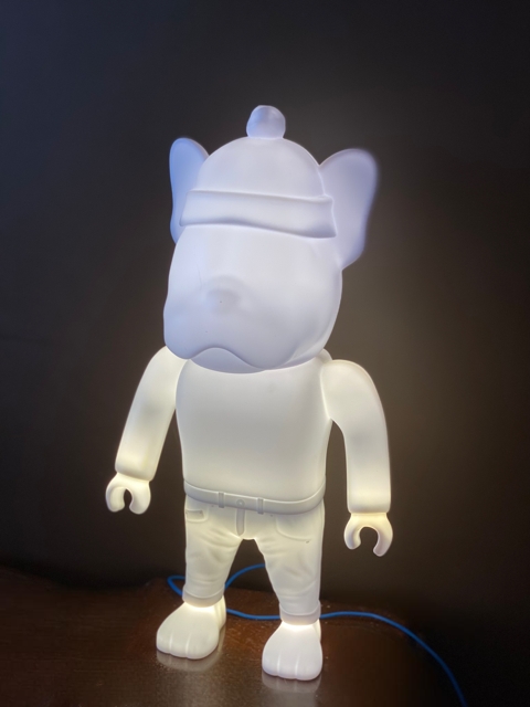 Stor bordlampe i heltre med skjerm. Lampen er redesign av en elefant pyntefigur i tre fra 50-60 tallet. Så i stedet for å "bare" være en figur med snabelen til værs, har den tatt steget over i belysnings univers og verden og blitt en bordlampe.