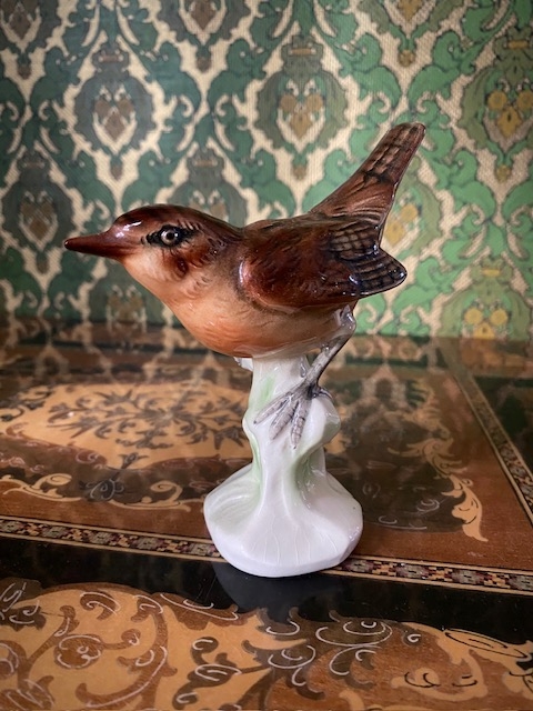 Dette fugleparet har tydeligvis vært et populært motiv første del av 1900 tallet, men opprinnelsen til vasen har jeg ikke klart å avdekket til tross at den er nummerert/ signert. Mål H17x L10x B8 cm. Produksjonsfeil på baksiden ellers i flott stand.
