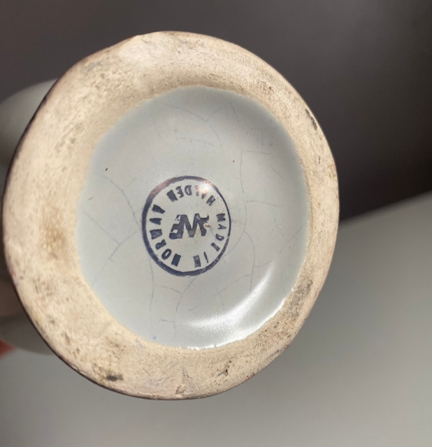 Vase i delikate lysgrå glasur med metallisk blå/lilla og gull detaljer. Foruten et lite knagg på undersiden, men som man kan se av bilde nr 4 og 5 påvirker ikke dette utseende eller på noe vis er skjemmende da det ikke vises når vasen står. H27,5x Ø7 cm.