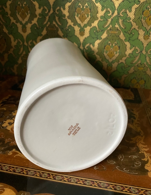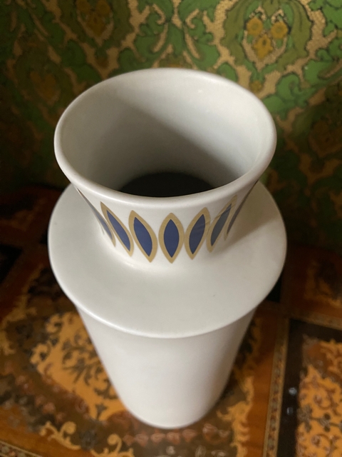 Vase i steingods Hvit matt glasur med mørkeblå/gull toppdekor 407/2 Arabia Finland 1960-tallet Vase med en enkel, tidløs og lekker design. Faktisk alder ikke kjent. Høyde ca 27 cm. Ingen skader eller skjemmende bruksmerker. NOK745,00 inkl. mva. På lager: 1 stk. Kjøp Ønskeliste Vipps hurtigkasseKjøp nå med Vipps hurtigkasse Del dette Produktinfo Varen kan sendes eller hentes etter avtale på butikklageret i Tysvær NB! man får spørsmål om hente/sending først etter at man har registrert adressen. Fast fraktpris 73 kr for kjøp <1000 kr og gratis frakt ved kjøp ≥1000 kr (Begge alternativene gjelder for forsendelser med vekt 0-10 kg). Har du bestilt, men hører ikke noe i fra meg? Sjekk mappen for spam mail.