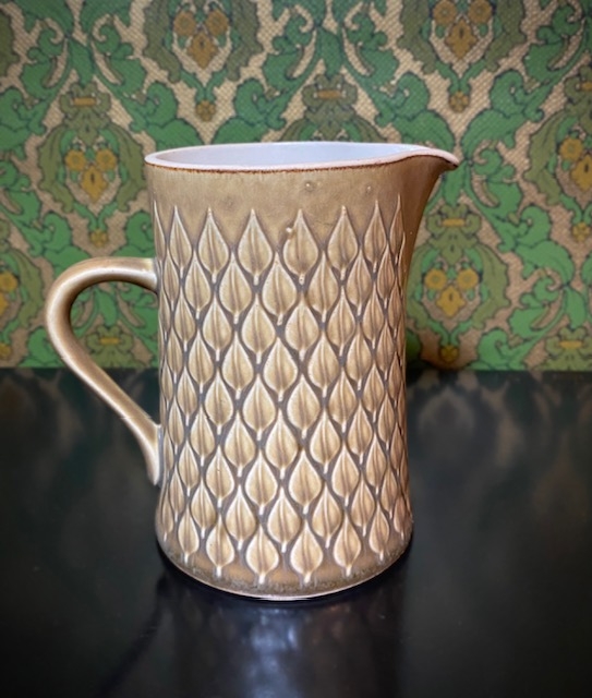 Kanne i en matt okergul farge dekorert med relieff bladdekor. Høyde ca 14 cm. Ingen skader eller skjemmende bruksmerker.