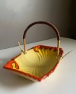 Dekorativ keramikk skål i herlig friske farger og med bambus hank. Mål H3,5x L20x B14 cm. Skålen er umerket men antas å være Tysk antikk keramikk. Ingen skader eller skjemmende bruksmerker, i flott vintage stand.