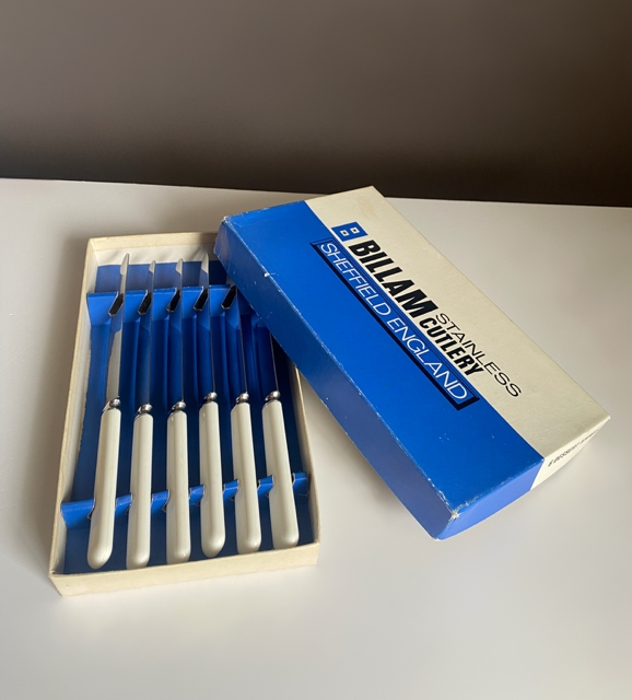 BILLIAM stainless Cutlery knivsett, 6 dessert kniver i original eske - Sheffield England 1960 tallet