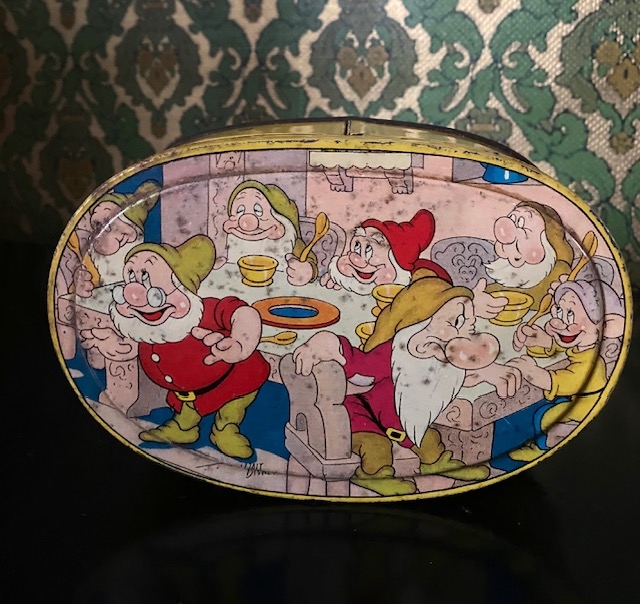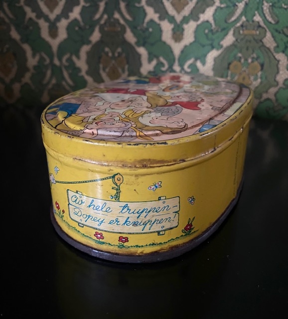 Boksen antas å være fra første halvdel av 1900-tallet. Mål ca H4,5x L23,5x B12,5 cm. Boksen har fått noen bulker og skjevheter, samt det finnes aldersrelatert patina/ slitasje. Til tross for patina er motiv og farger godt ivaretatt og boksen er dekorativ.