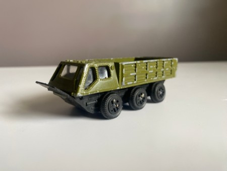 Militært kjøretøy i metall og understell i plast, ikke nummeret. Ingen skader eller kjente mangler, men bruksslitasje og avskalling.