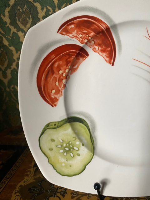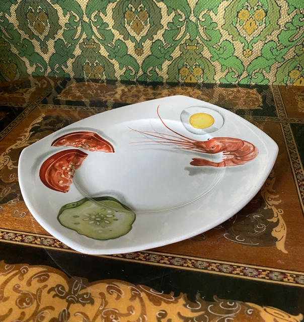 1 stk kaffekuvert, kopp med tallerken og asjett. Tidstypiske farger og dekor. Mål kopp H5x Ø8,5 cm, fat Ø14 cm og asjett 20,5 cm. Ingen skade eller skjemmende bruksmerker, i flott vintage stand.