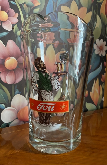 En svært spesiell karaffel med 6 stk tilhørende glass/ krus med hank. Opprinnelse og alder ukjent, men sirkusbjørner er/var vanlig i bl.a Russland. Ingen skader eller skjemmende bruksmerker, i flott vintage stand. Karaffelen H26 cm og glass H4x Ø3,3 cm.