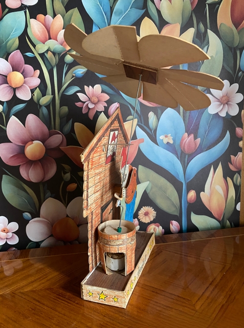 En ekstra flott versjon av BRIO nissen i plast ( H17,5 cm). Denne nissen har nemlig en velur lignende rød nissefrakk og lue og ikke bare malte overflater. Det er litt slitasje og en flekk, men han er frisk i fargen og har et stort sjarmerende smil.