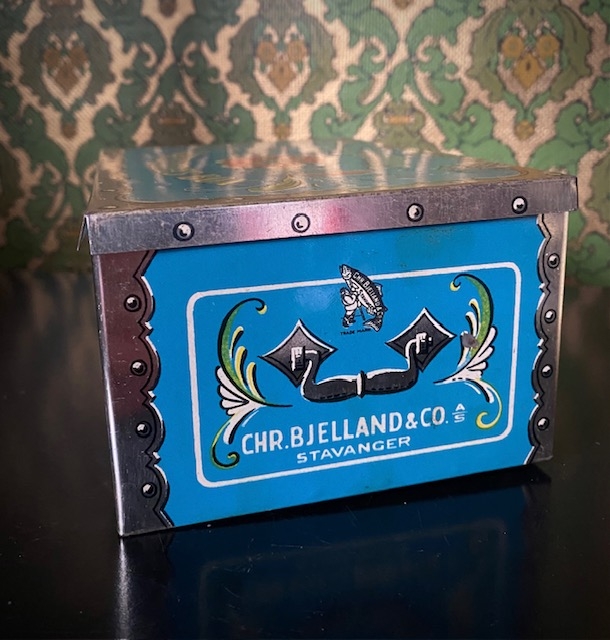 Reklame Bjellands Christmas box blikkboks/skrin med hengslet lokk CHR. BJELLAND & CO A/S Stavanger Norge 1940-tallet