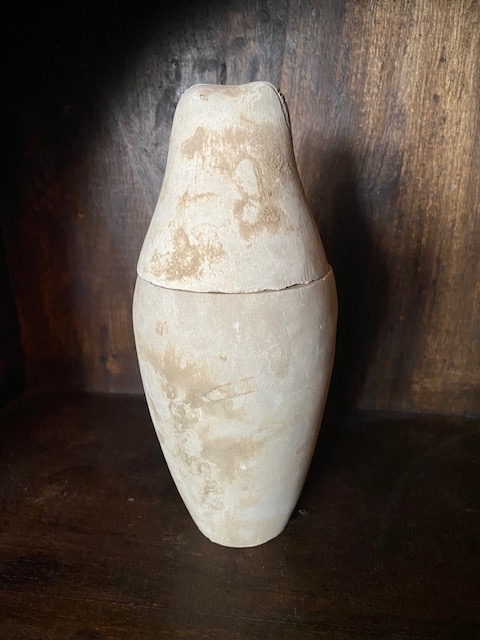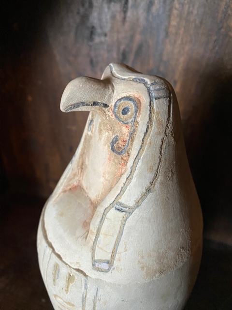 Tidligere eier oppgav at den ble kjøpt i Egypt for 30 år siden og at den er blitt vurdert til å være antikk. Mål ca H22xØ9 cm. Bavian hodet symboliserer Guden Hapi en av Horus` fire sønner. Ingen skader, men det finnes alders relatert patina.