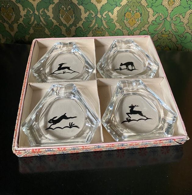En svært spesiell karaffel med 6 stk tilhørende glass/ krus med hank. Opprinnelse og alder ukjent, men sirkusbjørner er/var vanlig i bl.a Russland. Ingen skader eller skjemmende bruksmerker, i flott vintage stand. Karaffelen H26 cm og glass H4x Ø3,3 cm.