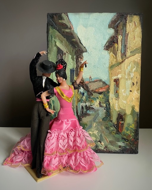 Et uvanlig flott signert maleri (ikke trykk) av et par i lidenskapelig flamenco dans. Mål 2,5x 40x 30,5 cm. Faktisk alder og kunstner er ukjent. Det finnes litt smuss og patina, men mye av det vil kunne fjernes av en profesjonell og tålmodig sjel.