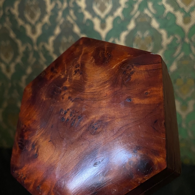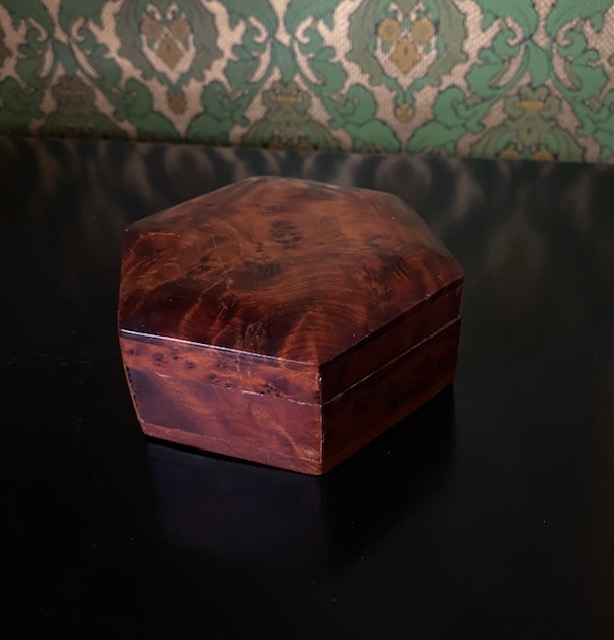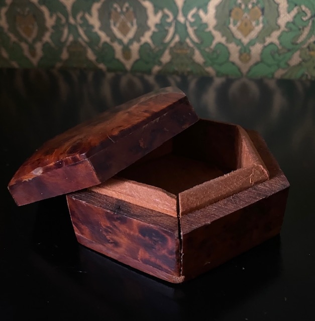 Faktisk alder og opprinnelse til dette dekorative skrinet er ukjent. Det er rikt dekorert. blant annet med innlagt dekor i lokk. Mål H6xX L20 xB9 cm. Ingen skader eller skjemmende bruksmerker, skrinet fremstår i pent brukt stand.