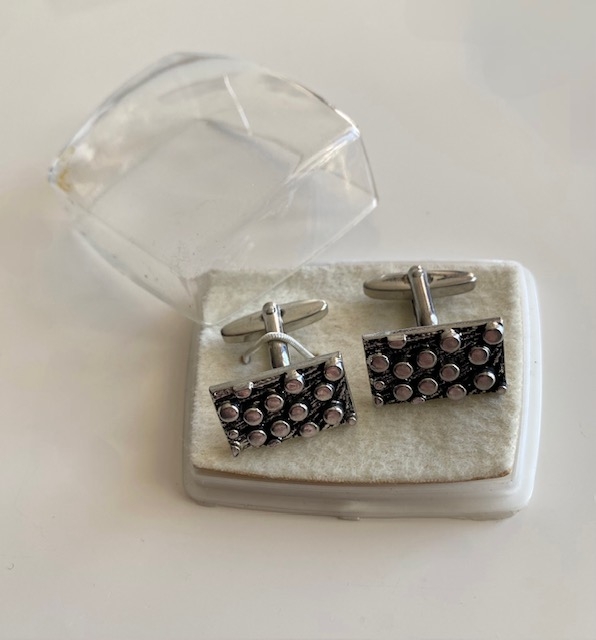 Emaljert manskjettknapper og slipslenke i sølv av Nils Martin Elvik. Mansjettene måler 2,3x 1,1 cm og er merket "Br. N. 925s". En av knappene har en skavank i emaljen da den har blitt loddet/sveiset på baksiden. Slipslenken måler 4,0x Ø1,0 cm.