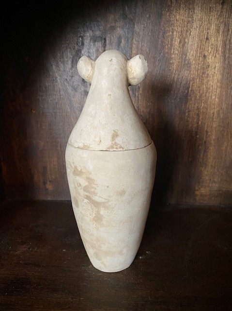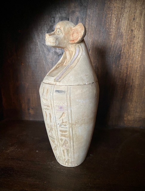 Tidligere eier oppgav at den ble kjøpt i Egypt for 30 år siden og at den er blitt vurdert til å være antikk. Mål ca H22xØ9 cm. Bavian hodet symboliserer Guden Hapi en av Horus` fire sønner. Ingen skader, men det finnes alders relatert patina.