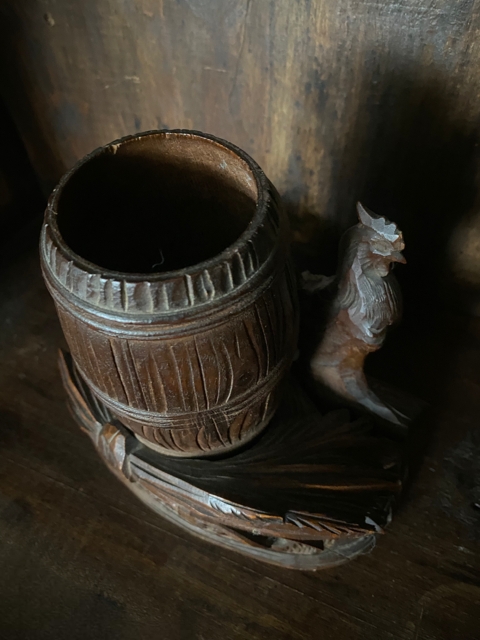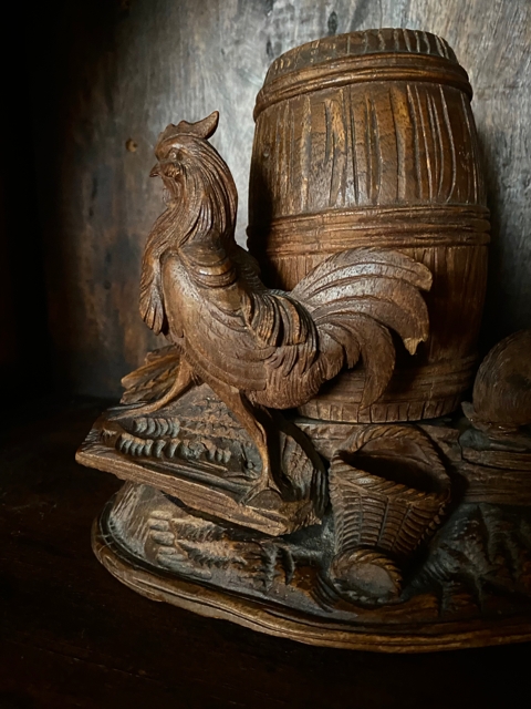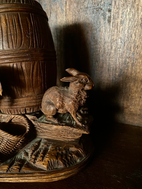 Antikk tobakksboks tobacco jar Black Forest design beholder håndskåret edeltre hane hare trefigur treskulptur Franrike