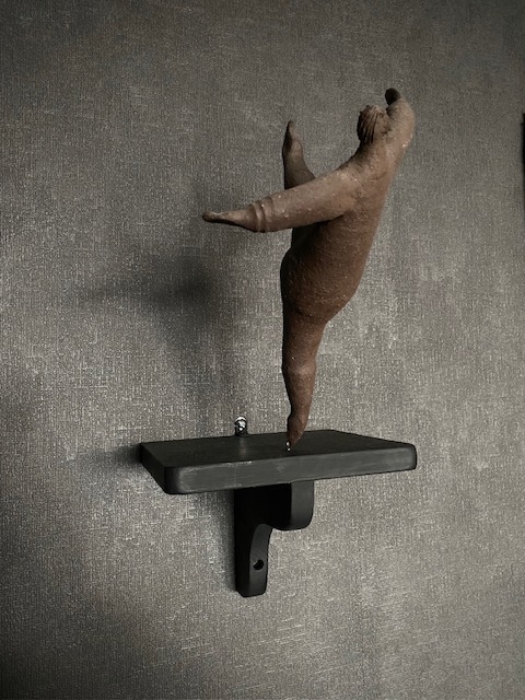 Mindre figur i sprøytemalt keramikk, merket og nummerert (2026). Mål H11x L9x B7 cm. Figuren har områder hvor malingen er slitt/avskallet, men som man ser på bildene påvirker dette i mindre grad helhetsinntrykket. Figuren fremstår i fin vintage stand.