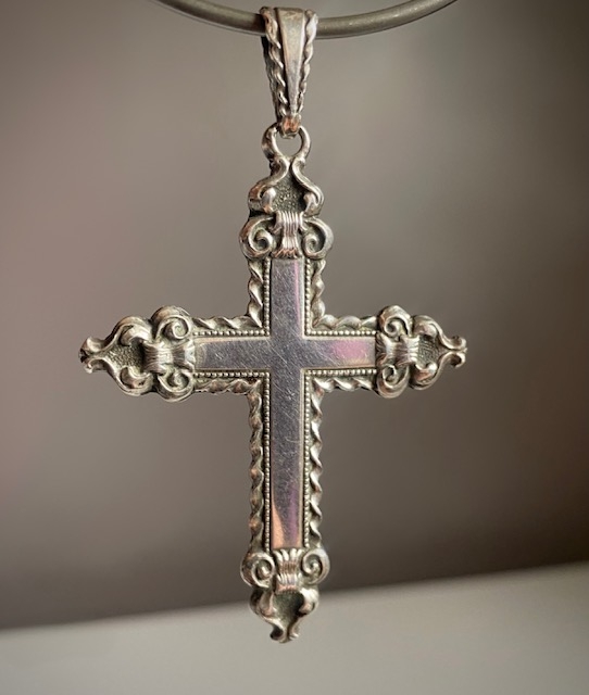 Stort og rikt utsmykket kors stemplet 830S+ mestermerket til Kristian Hestenes. Mål ca 5,9x 4,3 cm. Det finnes patina/ slitasje, men fremstår allikevel i flott vintage stand.