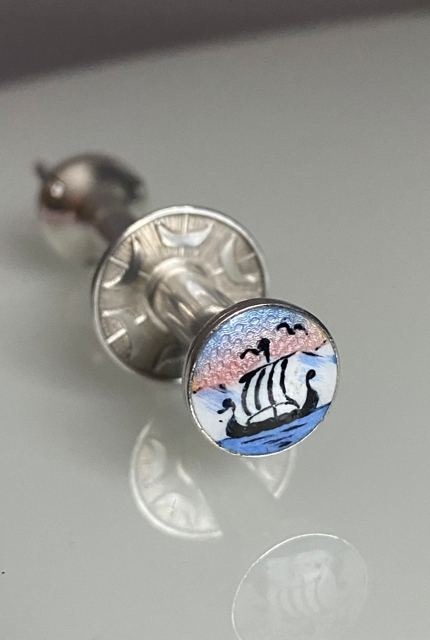 Emaljert sukkerbitklype i sølv (vikingskip). Mål L11cm Ø2 cm. Flott stand
